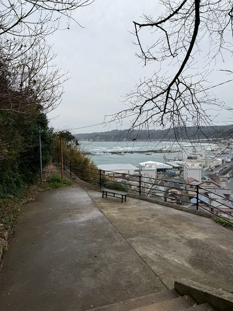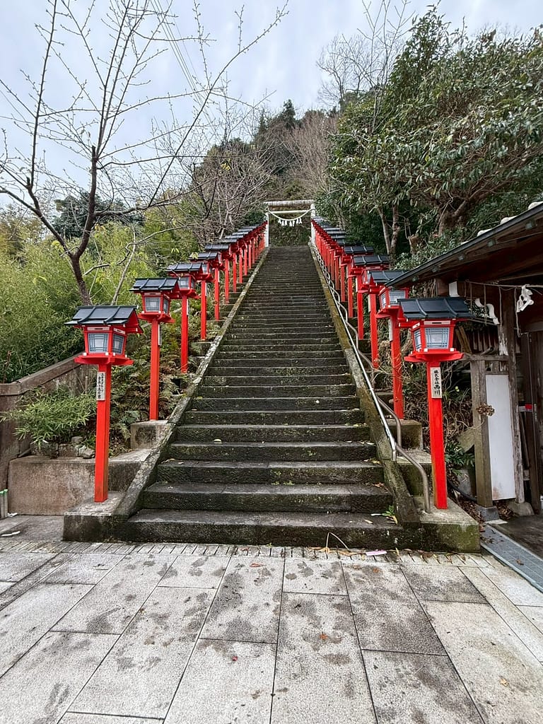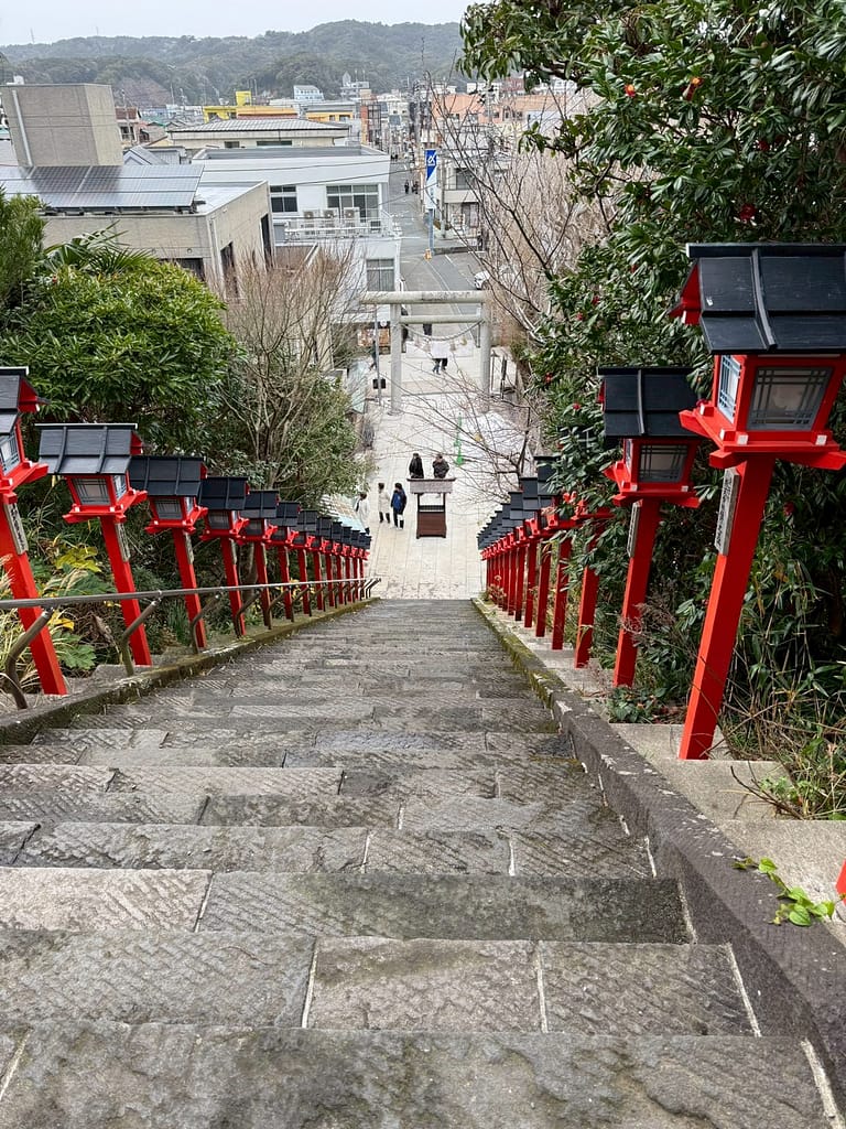 毎年2月下旬から3月3日まで開催される「かつうらビッグひなまつり」が有名ですが、そのメイン会場となる遠見岬神社の「冨咲の石段」。遠見岬は「冨咲」に通じることから、この60段の石段を登ると「冨が咲き幸せになる」とも言われているとのこと。
