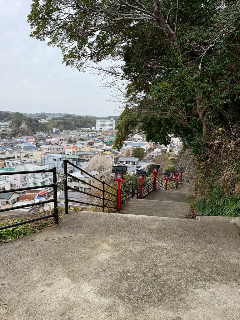 勝浦市街を見下ろす高台にある神社。朝市会場の奥あたりから長い石段があり、さらに山を登った高台にあります。