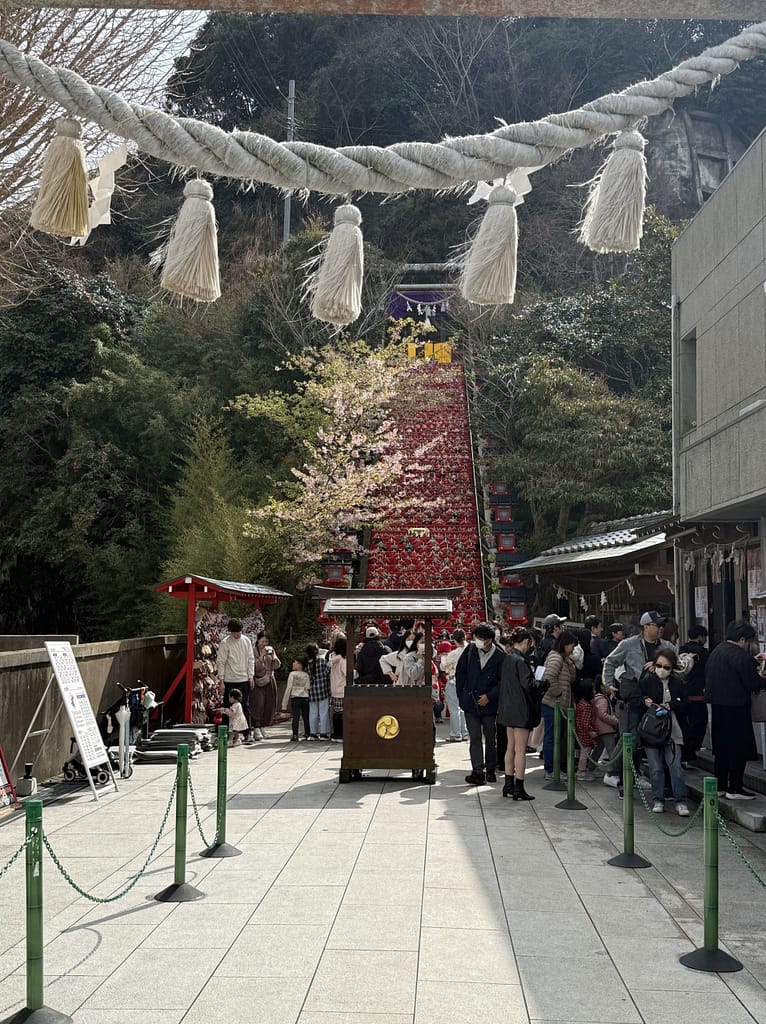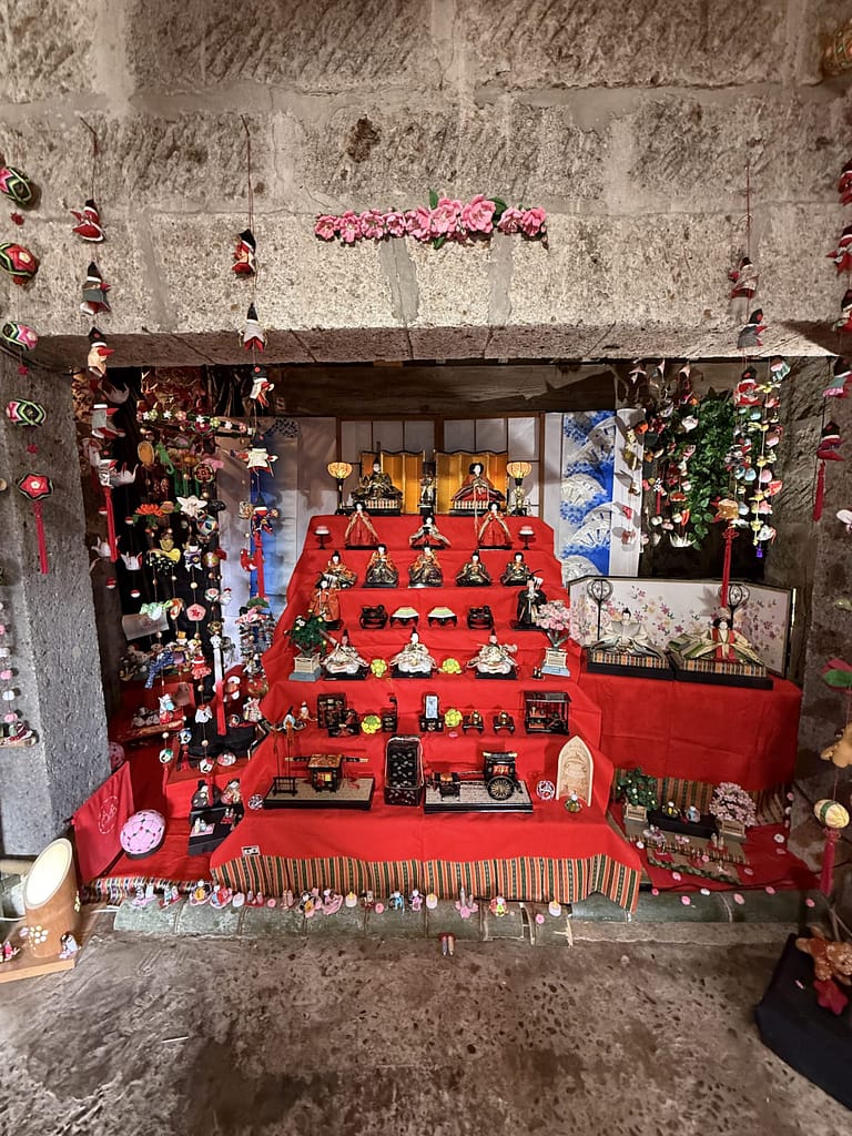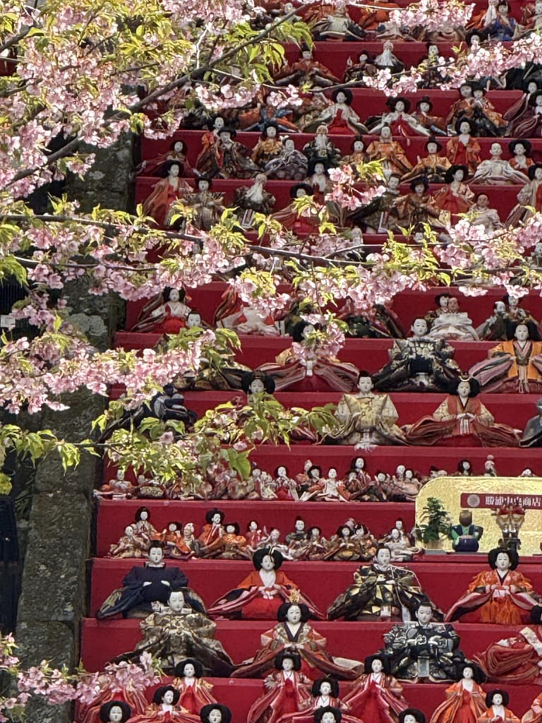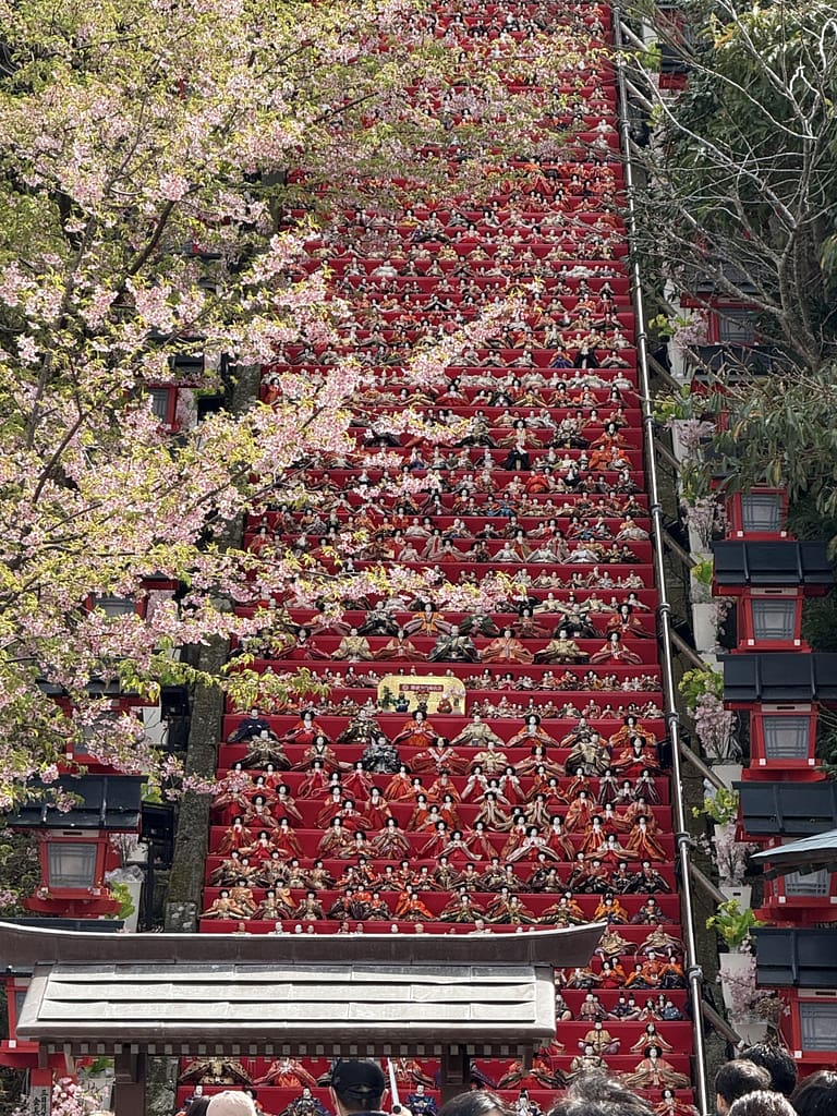 なかでも遠見岬(とみさき)神社の石段60段に並ぶひな人形は圧巻です。